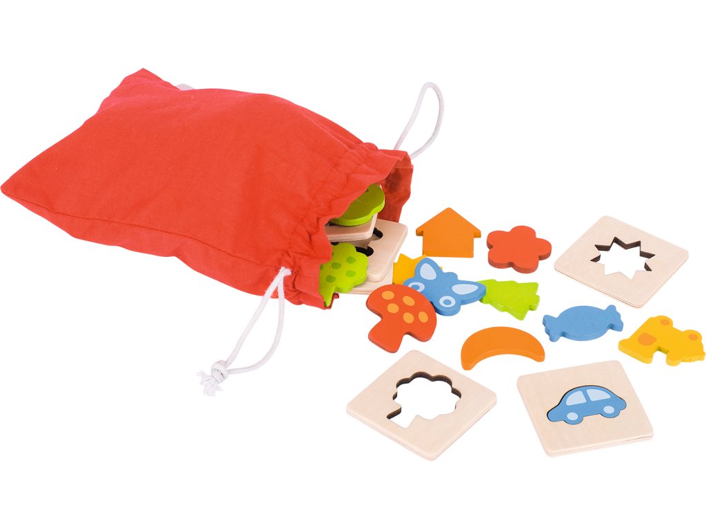 Sada obsahuje 16 dřevěných rámečků (přírodní) a 16 barevných dřevěných figurek (celkem 32 dílů) o rozměru přibližně 5,9 x 5,9 cm, a jeden bavlněný sáček pro zakrytí figurek. Hráči (1–4) sahají do sáčku, snaží se hmatem najít figurku, která odpovídá jejich rámečku, a tím trénují rozlišování tvarů bez využití zraku.